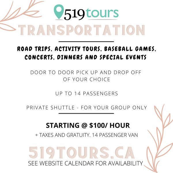 Need a little adventure in your life? Let 519 Tours give you some ideas for local activities. Or perhaps you already know the destination and just need a ride, that's ok too! What happens on a 519 Tour, can stay there (if you want).